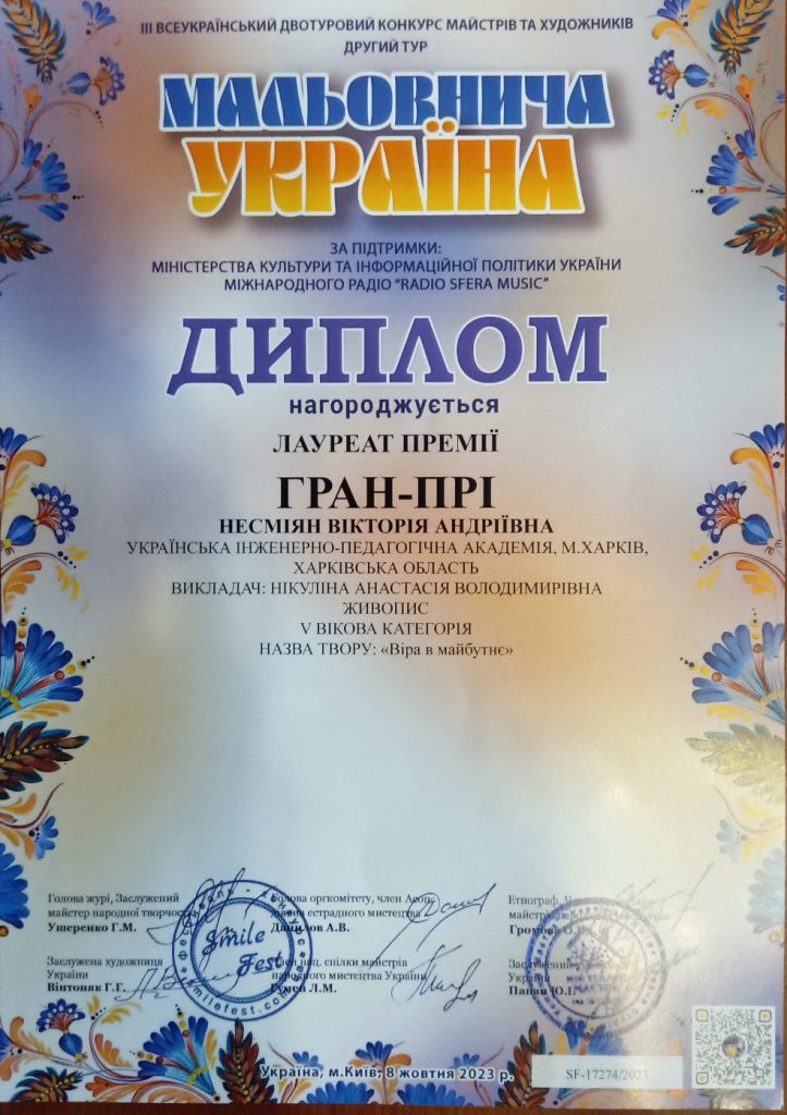 Несміян Вікторія (група ПОТ23мг) – ГРАН-ПРІ; номінація — Живопис;